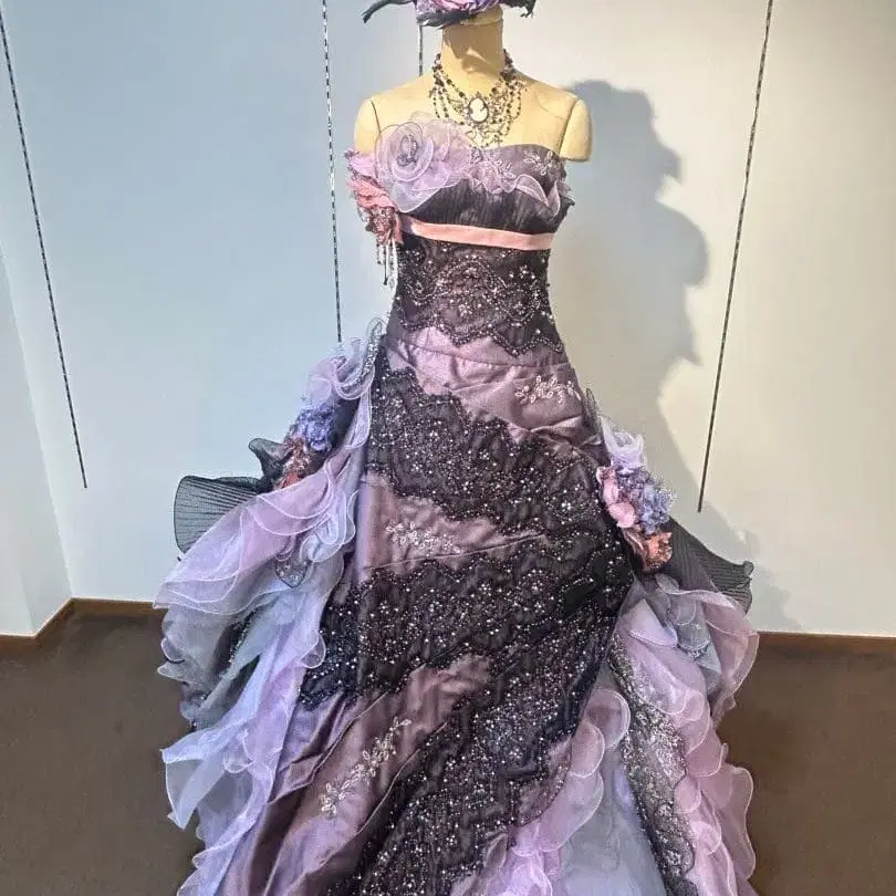 자동 번역되었어요. 원문보기플라워 모티브와 비즈 장식이 더해진 보라색 계열의 머메이드 라인 드레스.