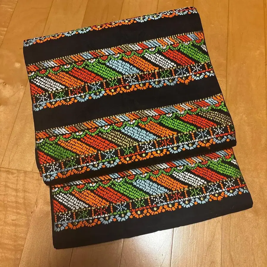 후쿠로 오비 육통 무늬 블랙 바탕에 컬러풀한 자수