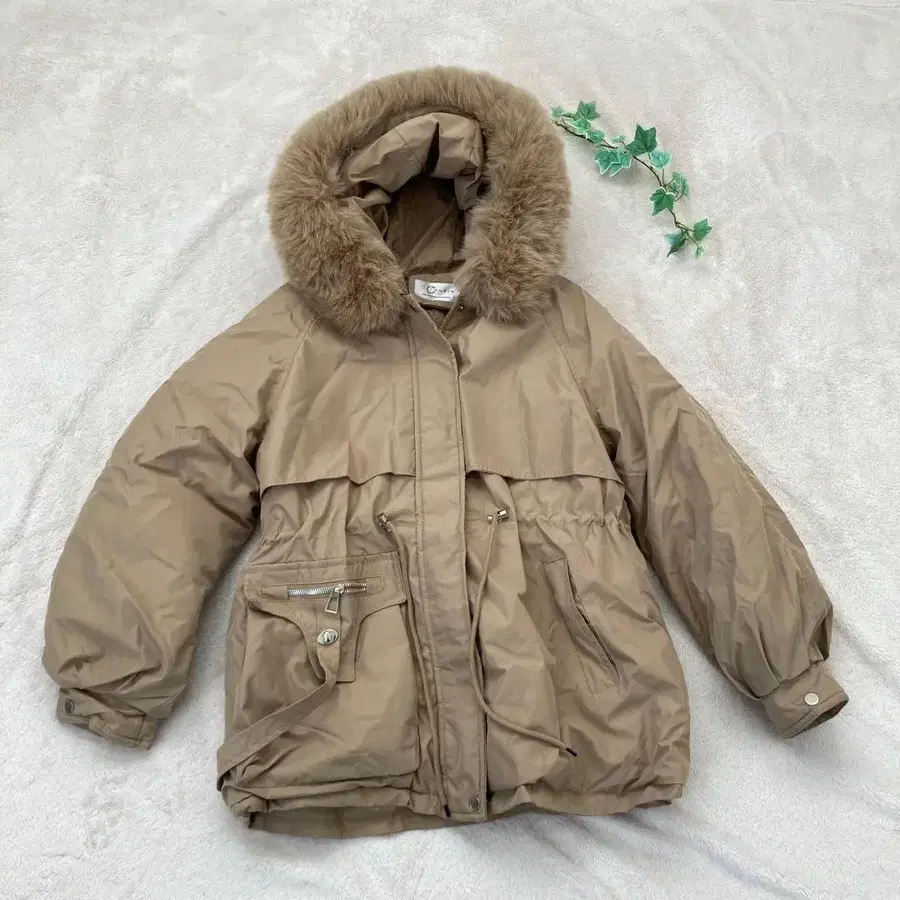 베이지 모즈 코트 퍼 부착 후드