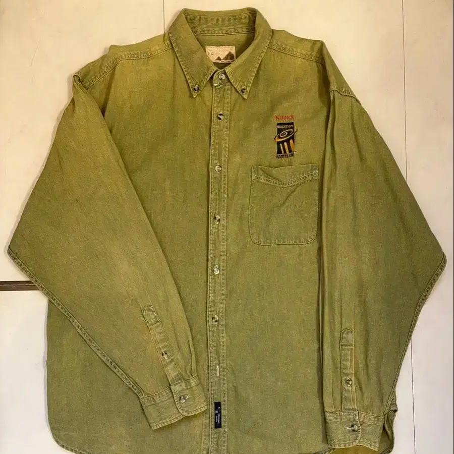 올리브 그린 빈티지 데님 긴팔 셔츠