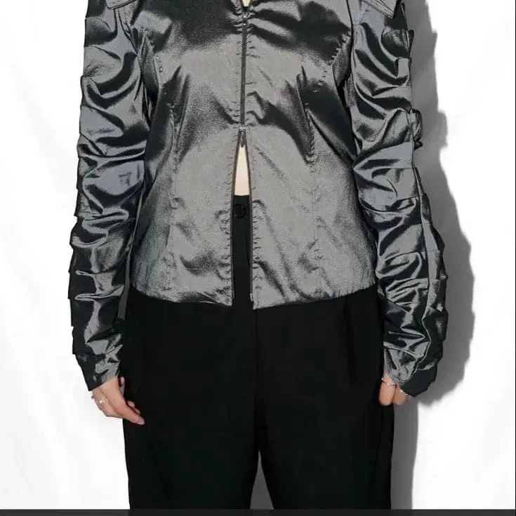 입체적으로 셔링을 잡은 슬리브가 인상적인, 캐나다제 빈티지 숏 자켓. 메탈릭한 광택을 띤 특수 소재가 각도에 따라 표정을 바꾸며, 모드한 존재감을 발산합니다. 컴팩트한 기장에 비해 팔에 볼륨을 준 실루엣 밸런스는, 90s~00s 아카이브를 연상시키는 미래적인 디자인. 프론트는 더블 지퍼 사양으로, 스타일링에 따라 개폐의 뉘앙스를 컨트롤할 수 있습니다. 이너는 탱크탑이나 메쉬, 와이드 슬랙스와의 궁합이 발군. 라이트 아우터로서도, 레이어드의 악센트로서도 활약하는 한 벌. 기장: 55cm 가슴 너비: 52cm 소매 길이: 64cm 어깨 너비: 41cm 표기 사이즈: 10 소재: 49% POLYESTER 44% NYLON 7% LYCRA 신사이바시의 셀렉트 구제 의류 가게에서 구매했지만, 저에게는 맞지 않는다고 생각하여 한 번도 입지 않았습니다. 코디해 주실 수 있는 분, 꼭 검토해 주세요! 착용 이미지는 여성이지만, 저(176cm, 64kg)도 이너가 얇으면 문제없이 착용할 수 있었습니다!
