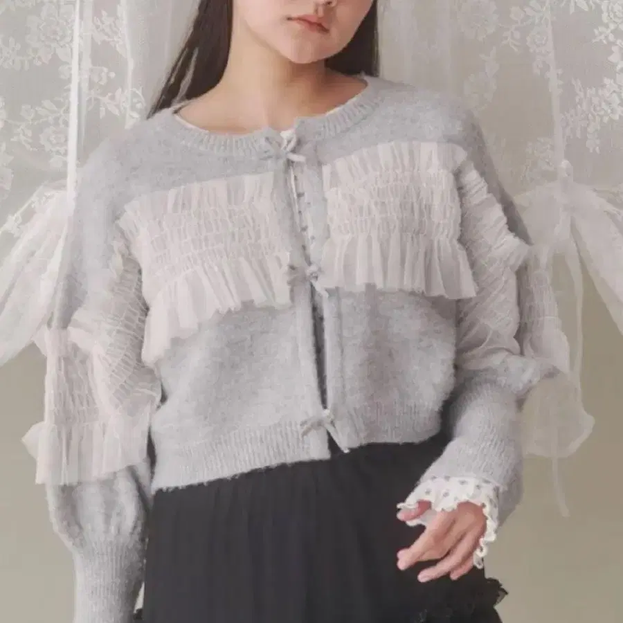 merry jenny 셔링 튤 니트 가디건 그레이