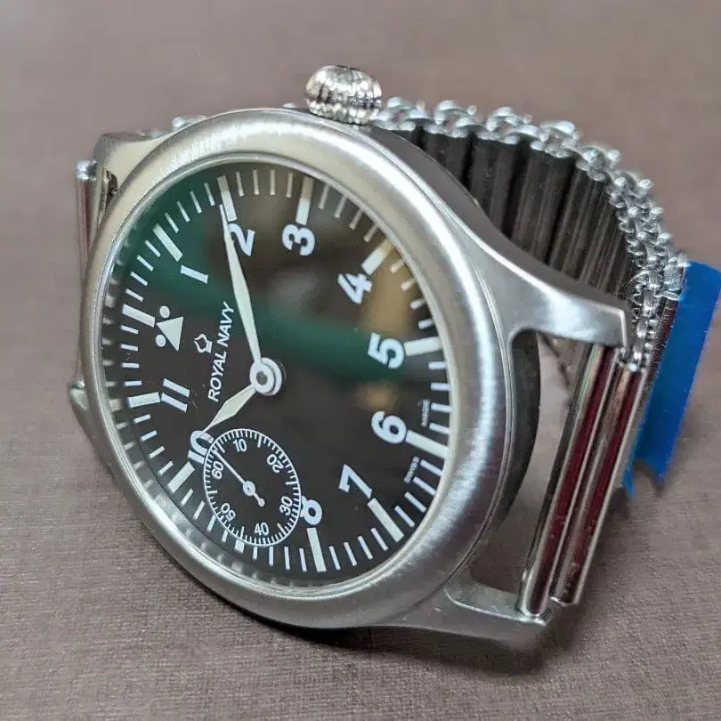 오르피나(orfina)의 밀리터리 워치, 마린 플리거입니다. 영국 해군의 이름을 땄지만 오르피나의 마크가 있습니다. 뒷면 커버에도 www.orfina.ch와 Marine Fliegeruhr라고 각인이 있습니다. 오르피나 워치 컴퍼니는 1922년, 스위스의 그렌첸에 설립되었습니다. 설립 초기부터 내구성이 뛰어나고 실용적이며 튼튼한 시계를 제조했습니다. 그 결과, 항공 시계, 항해용 시계, 군용 시계 제조에서 큰 성공을 거두었습니다. 내구성이 뛰어나고 실용적인 시계를 만드는 오르피나는 포르쉐 디자인 최초의 크로노그래프 제조를 수주하며 인지도를 높였습니다. 수동 와인딩 유니타스 6497을 탑재했으며 9시 위치에 스몰 세컨드가 있습니다. 크기는 케이스 지름 41mm, 러그 폭 22mm입니다. 벨트는 밤부 브레이슬릿을 착용했지만, 사용감이 있는 정품 가죽 밴드도 함께 드립니다. 큰 타흔이나 흠집은 없지만, 중고품이므로 사용에 따른 마찰과 작은 흠집은 있습니다.