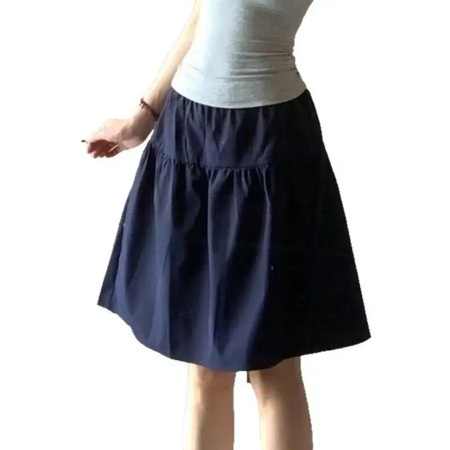 네이비 플레어 스커트 무릎 기장 코튼 혼방