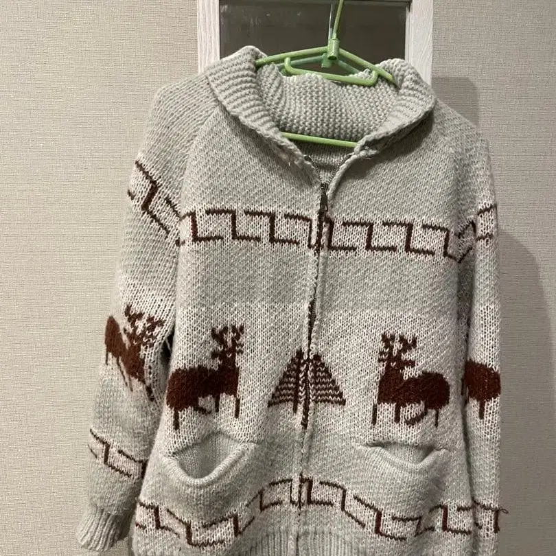 후드 부착 니트 가디건 사슴 패턴 그레이