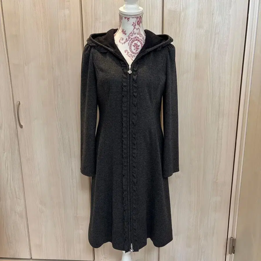 앞 지퍼부터 후드까지 프릴이 달린 귀여운 코트입니다. 후드 부분에 보관으로 인한 주름이 약간 있습니다.