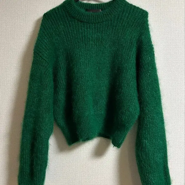자동 번역되었어요. 원문보기모헤어풍 소재로 만들어진 그린 크롭 스웨터.