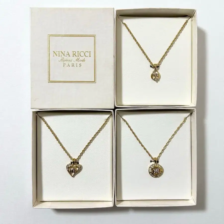 NINA RICCI ( 니나리치 ) 의 목걸이 3세트입니다. 하트 모티브, 물방울 모티브, 로고 디자인의 각각 다른 탑으로, 심플하면서도 고급스러운 골드 컬러로, 그날의 기분이나 코디네이트에 맞춰 바꿔 사용할 수 있는 세트입니다.