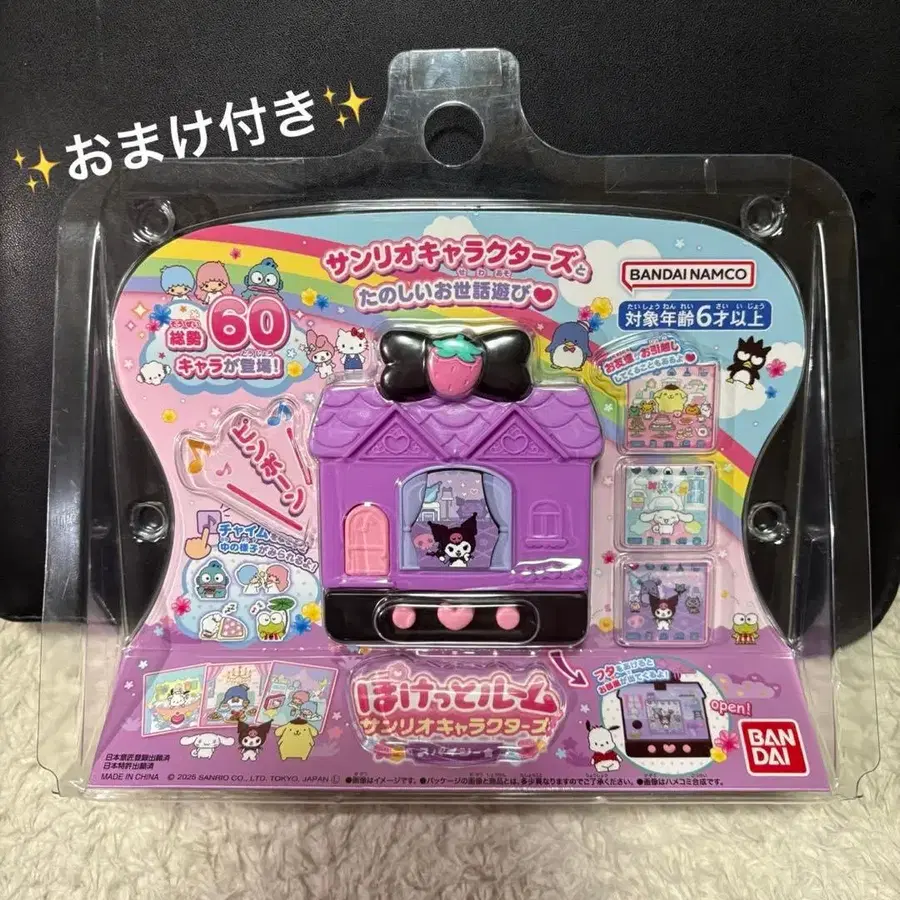 반다이 공식! 산리오 캐릭터즈 포켓룸 즐거운 돌봄 놀이 ♡ 인기 산리오 캐릭터즈가 등장하는 **집 모양 액정 완구 [ 포켓룸 ]** 입니다. 뚜껑을 열면 방이 나오고, 캐릭터들의 돌봄 놀이나 미니게임을 즐길 수 있습니다 ♪ ⸻ ○ 상품의 포인트 총 60 캐릭터 등장 키울 수 있는 캐릭터는 12종류 ( 헬로키티 / 쿠로미 / 시나모롤 / 폼폼푸딩 등 ) 밥, 목욕, 쓰다듬기, 청소 등 즐거운 돌봄 놀이 충실 미니게임 4종류 탑재 방 꾸미기나 외출 요소도 ◎ ⸻ ◯ 세트 내용 포켓룸 본체 사용설명서 ※ 이미지에 보이는 것이 전부입니다 ⸻ ◯ 상품 정보 제조사: BANDAI ( 반다이 ) 대상 연령: 6세 이상 사이즈: 약 17cm 색상: 스파이시 ( 보라색 계열 ) ※ 게임 내용은 다른 색상과 동일합니다 ⸻ ◯ 상태 새상품 / 미사용 ⸻ ◯ 이런 분께 추천합니다 산리오를 좋아하는 아이들 쿠로미, 시나모롤 팬 생일 / 크리스마스 선물로 ⸻ 사진 3번째 쿠로미 수납 파우치 덤으로 드립니다! ( 미개봉 새상품 ) 즉시 구매 OK ⭕️ 에어캡으로 정성껏 포장하여 24시간 이내에 발송합니다 ♪ 질문이 있으시면 언제든지 편하게 문의해주세요 ♪