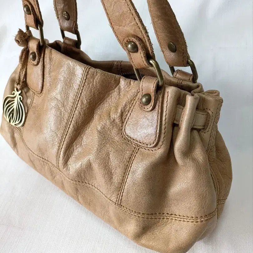 베이지 천연 가죽 핸드백 메탈 참 포함