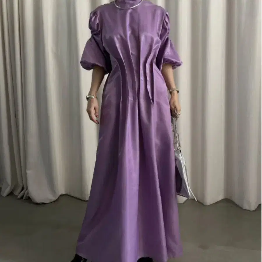 Ameri vintage 개더 슬리브 허리 턱 드레스 퍼플