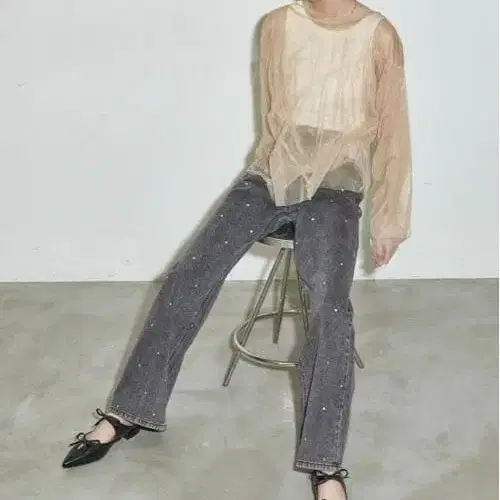 비즈 장식 그레이 와이드 레그 청바지