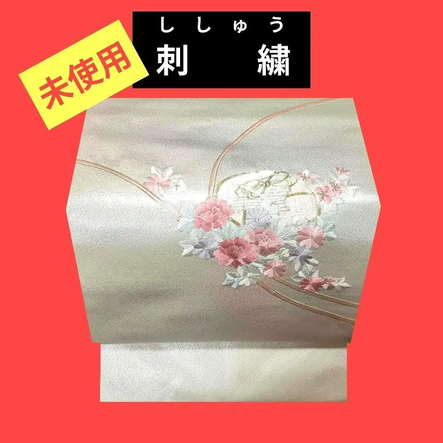 1010 미사용 기계 자수 나고야 오비 꽃과 문갑 (후바코)