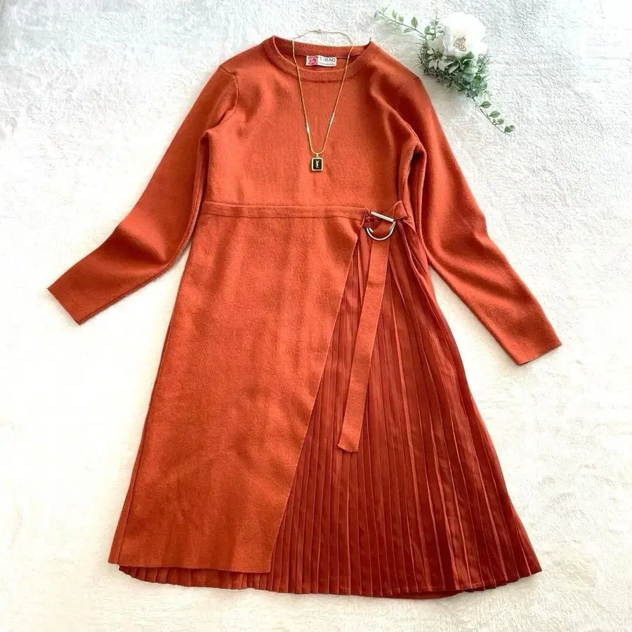 벽돌색 플리츠가 달린 니트 원피스 튜닉 상의 둥근 카라 M