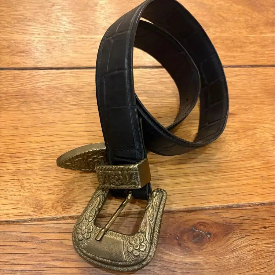 구제 의류 가게에서 구매한 1980~1990년대경 영국제의 웨스턴 벨트입니다. 묵직한 중후한 느낌의 가죽을 사용했습니다. 양면에 더해진 크로커다일 엠보 가죽과 큰 버클이 인상적인 디자인. 웨스턴 벨트 치고는 심플하지만 골드 컬러의 버클과 깃 끝 디자인이 임팩트 있는 디자인입니다.