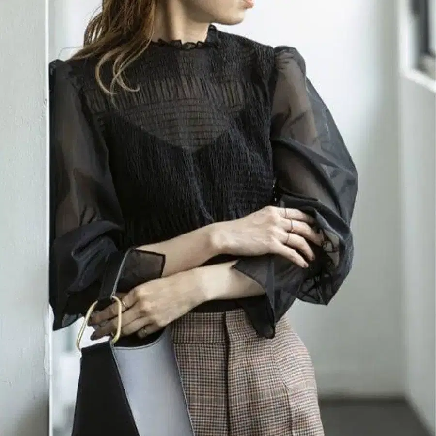바디 전체에 셔링을 넣어 고급스러운 존재감을 뽐내는 블라우스입니다. 빈티지 가공된 오간자 소재를 사용하여 광택과 탄력이 절묘하게 표현되며, 시어한 느낌과 함께 성숙한 달콤함을 어필할 수 있습니다. 적당히 바디를 따라가는 셔링 밴딩은 압박감 없는 부드럽고 가벼운 착용감을 선사합니다. 안으로 넣어 입거나 그대로 입었을 때 모두 깔끔하게 연출되는 기장과 밑단 디자인도 좋습니다. 깔끔한 하의와 함께 엘레강트한 스타일부터 데님과 함께 캐주얼 페미닌 스타일까지, 폭넓은 스타일링을 즐길 수 있는 아이템입니다.