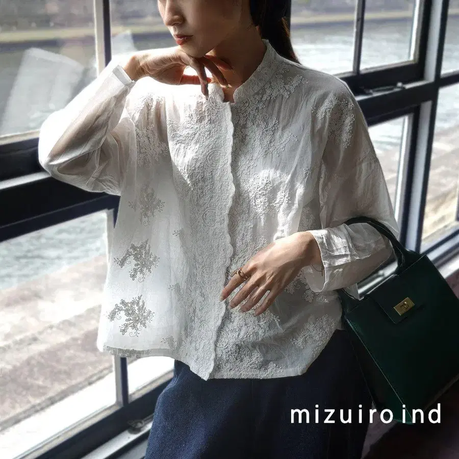 미즈이로 인드 레이스 스탠드 카라 와이드 셔츠 화이트