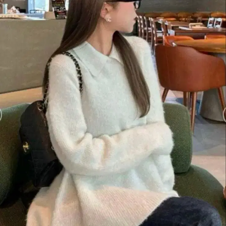 부드럽고 가벼우며, 털이 복슬복슬한 따뜻한 질감이 생기는 것은 모헤어 혼방 실을 사용했기 때문입니다. 편직 방식 덕분에 부드러우면서도 도톰한 두께감이 생겨 페플럼의 웨이브가 깔끔하게 나옵니다.