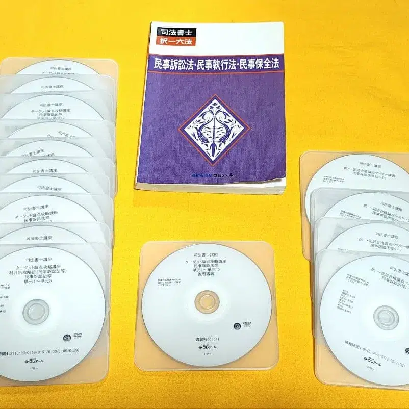 사법서사 강좌 민사소송법, 민사집행법, 민사보전법 강의 DVD, 택일 육법 세트입니다. 클레어의 통신 강좌로, 헤이세이 27년 수강한 것이므로, 이후의 민법 등 법 개정에 준거하지 않은 부분도 있을 수 있으니 미리 양해 부탁드립니다. ◯ 타겟 논점 공략 강좌 민사소송법 등 단원 1~40 10매 ◯ 타겟 논점 공략 강좌 민사소송법 등 단원 1~40 복습 강의 1매 ◯ 택일 기술 합격 논점 마스터 강좌 민사소송법 등 1~14 4매 ◯ 택일 육법 민사소송법, 민사집행법, 민사보전법 ※ DVD 케이스에 약간의 얼룩, 스크래치가 있는 것도 있으니 미리 양해 부탁드립니다. ※ 택일 육법에는 스크래치, 접힘, 연필로 쓴 글씨, 형광펜으로 표시한 부분이 다수 있습니다(사진 참조). 미리 양해 부탁드립니다. #사법서사강좌 #사법서사DVD #민사소송법강좌 #사법서사강좌참고서