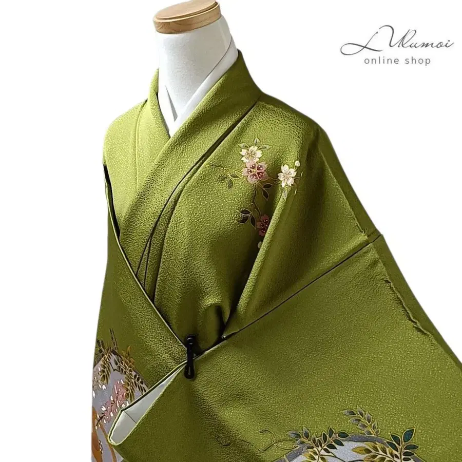 LULU45 기모노 순수 실크 츠케사게 그린 꽃무늬 새상품급