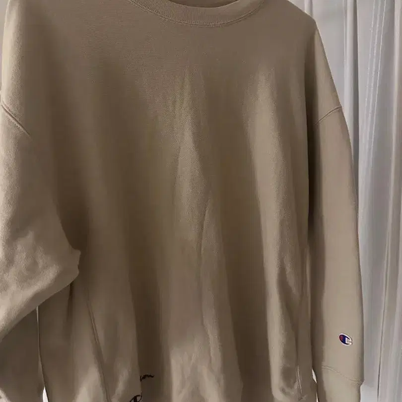 베이지 색상의 Champion 맨투맨, 부드러운 소재감과 로고 자수가 특징입니다.