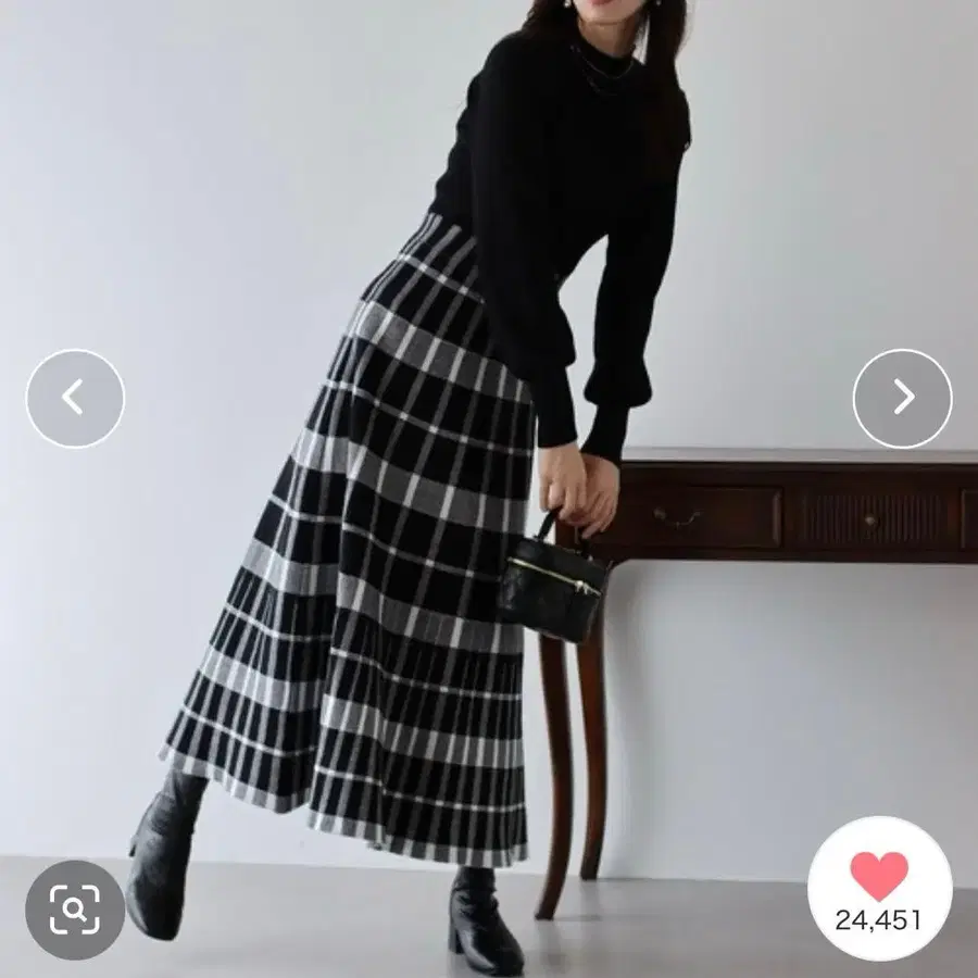스커트 부분은 스타일이 좋아 보이도록 신경 쓴, 밑단으로 갈수록 무늬가 작아지는 세로 체크 무늬를 짜 넣었습니다.