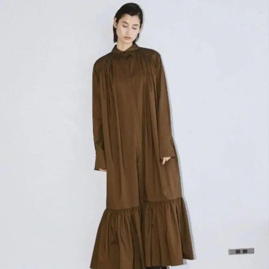 자동 번역되었어요. 원문보기브라운 플리츠 디자인의 롱 셔츠 원피스, 프릴 밑단이 특징입니다.