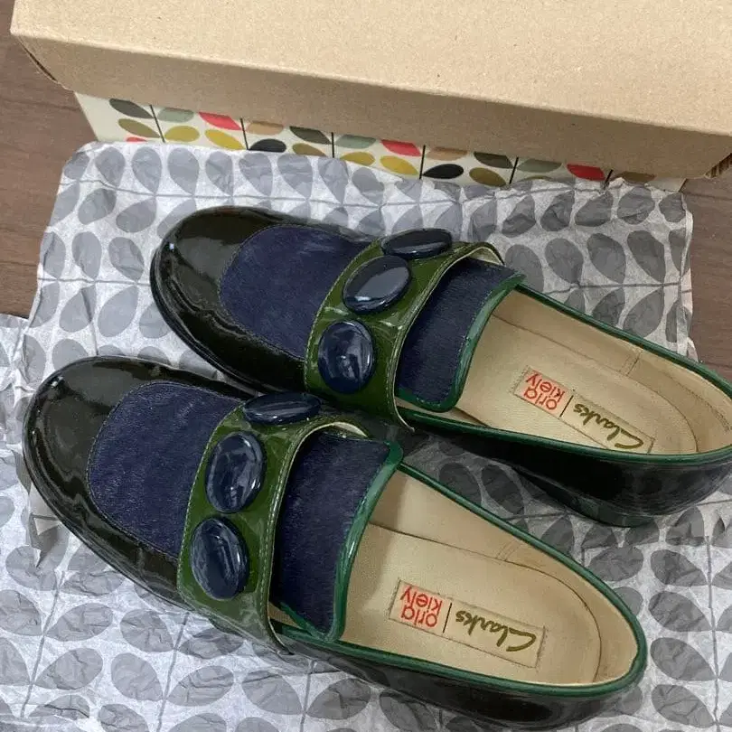 방문해 주셔서 감사합니다. 아우라 카일리 x 클락스의 콜라보 신발입니다. 한 번 착용했으며, 새상품급이라고 생각합니다. (안쪽 옆면에 자세히 보지 않으면 눈에 띄지 않을 정도의 마찰 있음) 에나멜과 패브릭의 콤비네이션으로, 캐주얼하게도, 가벼운 외출에도 사용할 수 있는 버튼이 달린 송치 로퍼입니다. - 브랜드: Clarks Orla Kiely - 색상: 그린 네이비 (네이비 그린) - 디자인: 버튼 달린 로퍼 - 소재: 에나멜 송치 - 스타일: 캐주얼 포멀 - 사이즈: 37 1/2 (24cm~24cm) 저는 보통 사이즈 24cm이며, 발볼이 넓은 편이라 약간 끼는 느낌이었습니다. 포장은 완충재로 감싸 간편 포장으로 발송됩니다. 박스 없을 경우 150엔 할인해 드리니 댓글 주세요^^ 반려동물 없음, 비흡연자입니다. 즉시 구매도 OK! 약간의 가격 인하 가능! 궁금한 점이 있으시면 댓글 주시면 감사하겠습니다. 잘 부탁드립니다.