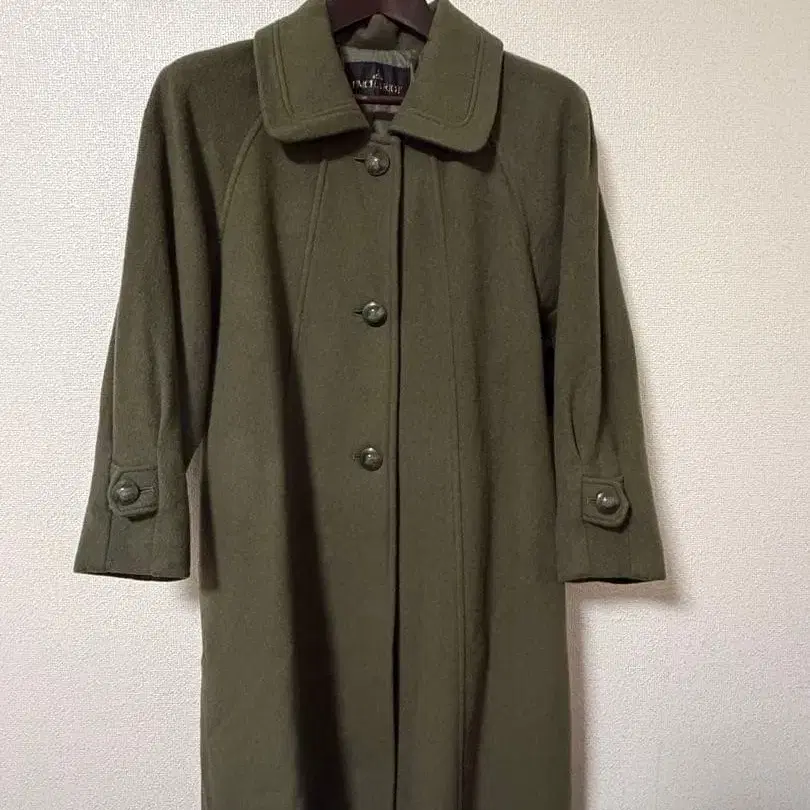 울 혼방 소재의 올리브 그린 롱 코트, 버튼이 달린 래글런 슬리브 디자인.