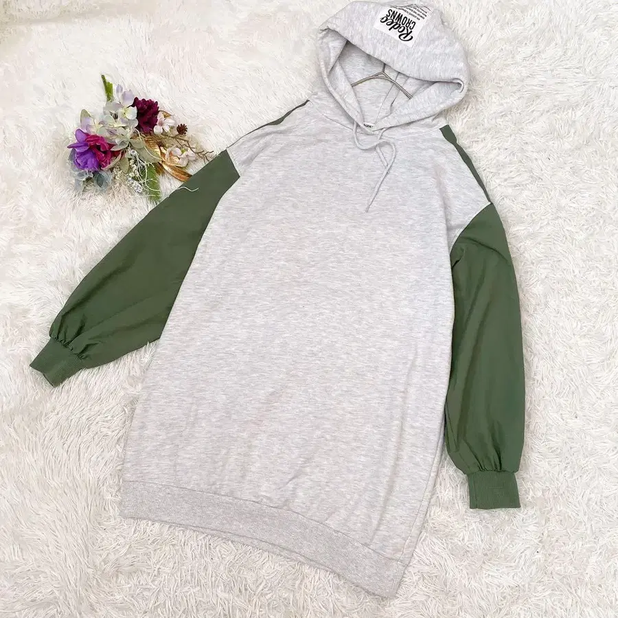 후드 부착된 그레이와 그린 색상의 후드 맨투맨, 캐주얼한 오버 사이즈 디자인.