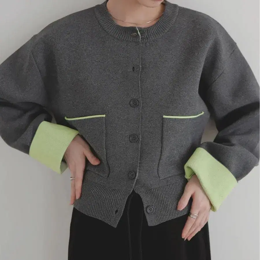 미사용 바이컬러 니트 가디건 그레이 x 그린 프리 사이즈