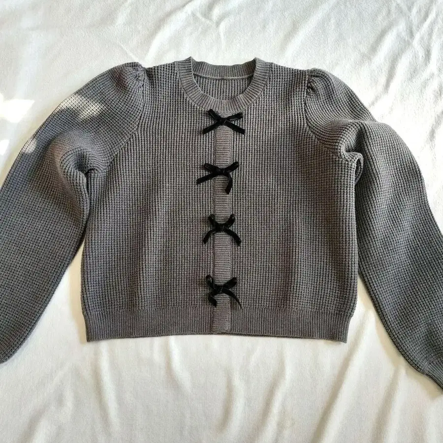 KUOSE 리본 포함 니트 그레이 퍼프 슬리브 와플 L 사이즈