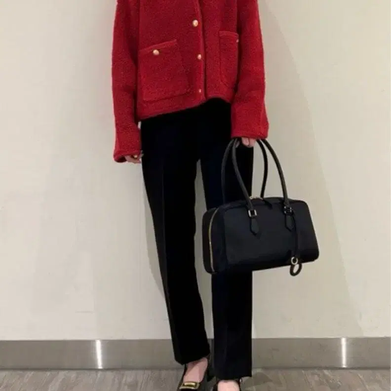 미라 오웬 금장 버튼 노카라 컴팩트 라메 니트 자켓 레드