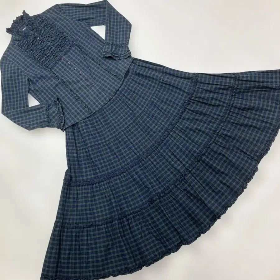 핑크하우스 그린 계열 체크 피코프릴 블라우스+스커트 세트