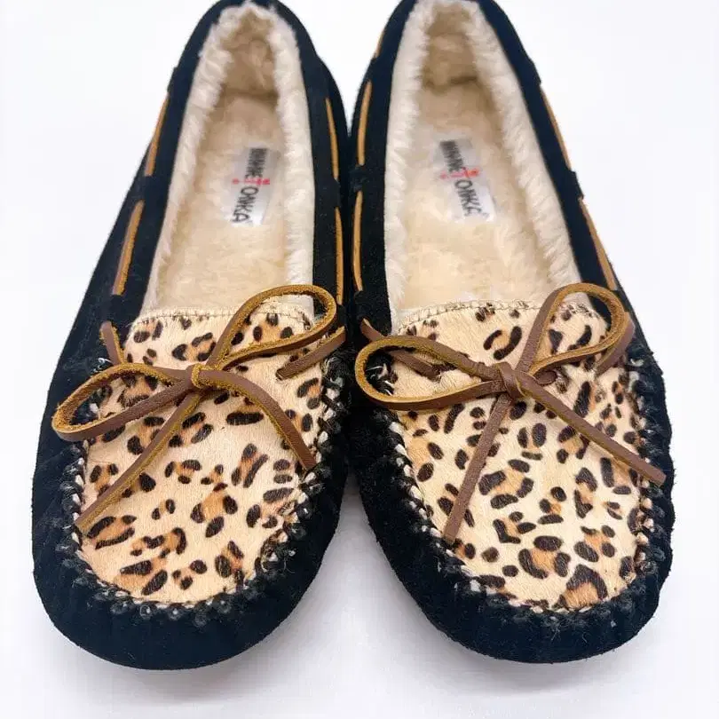 미네통카 리본 포함 모카신 블랙과 레오파드 무늬