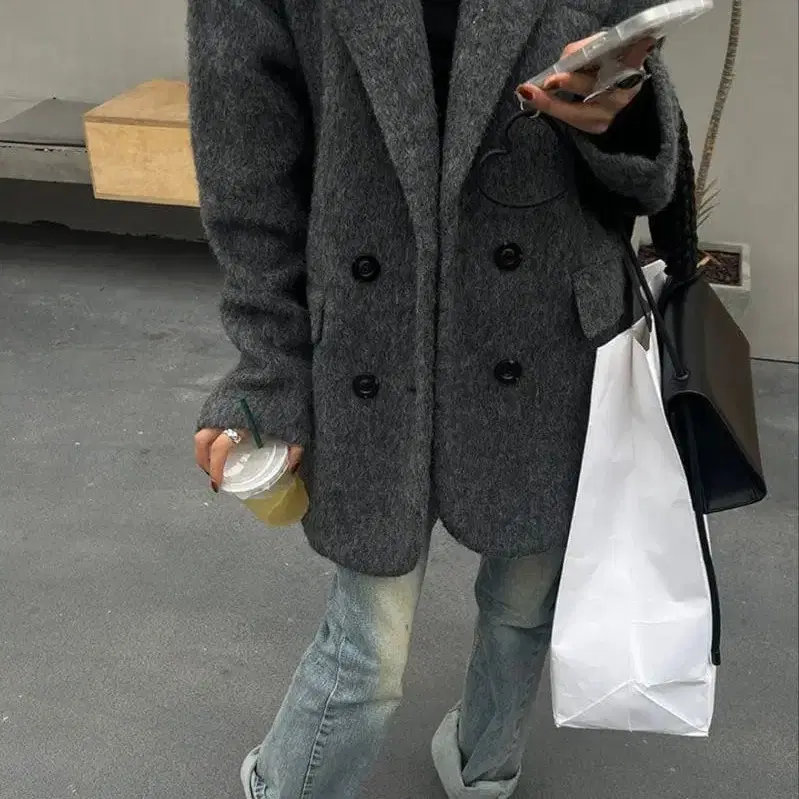 미들 기장 오버 사이즈 샤기 코트 차콜 그레이