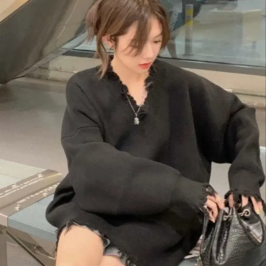 perverze 데미지 니트 블랙 리브 크롭 스웨터