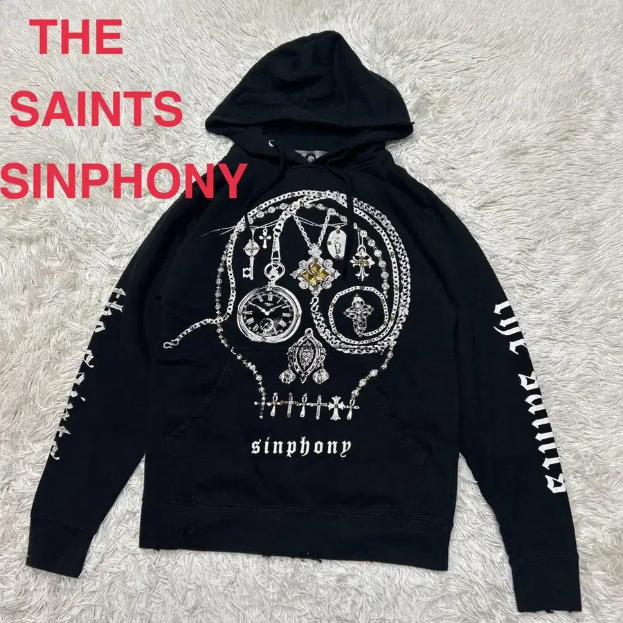 레어 44착 한정판 세인츠 심포니 해골 스터드 큐빅 데미지 가공 후드티.