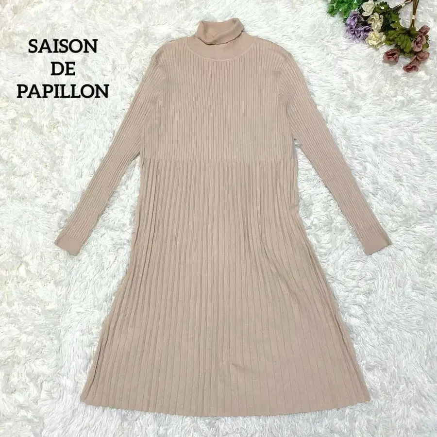 a824 [세존드파피용] 터틀넥 니트 원피스 플리츠 리브 M