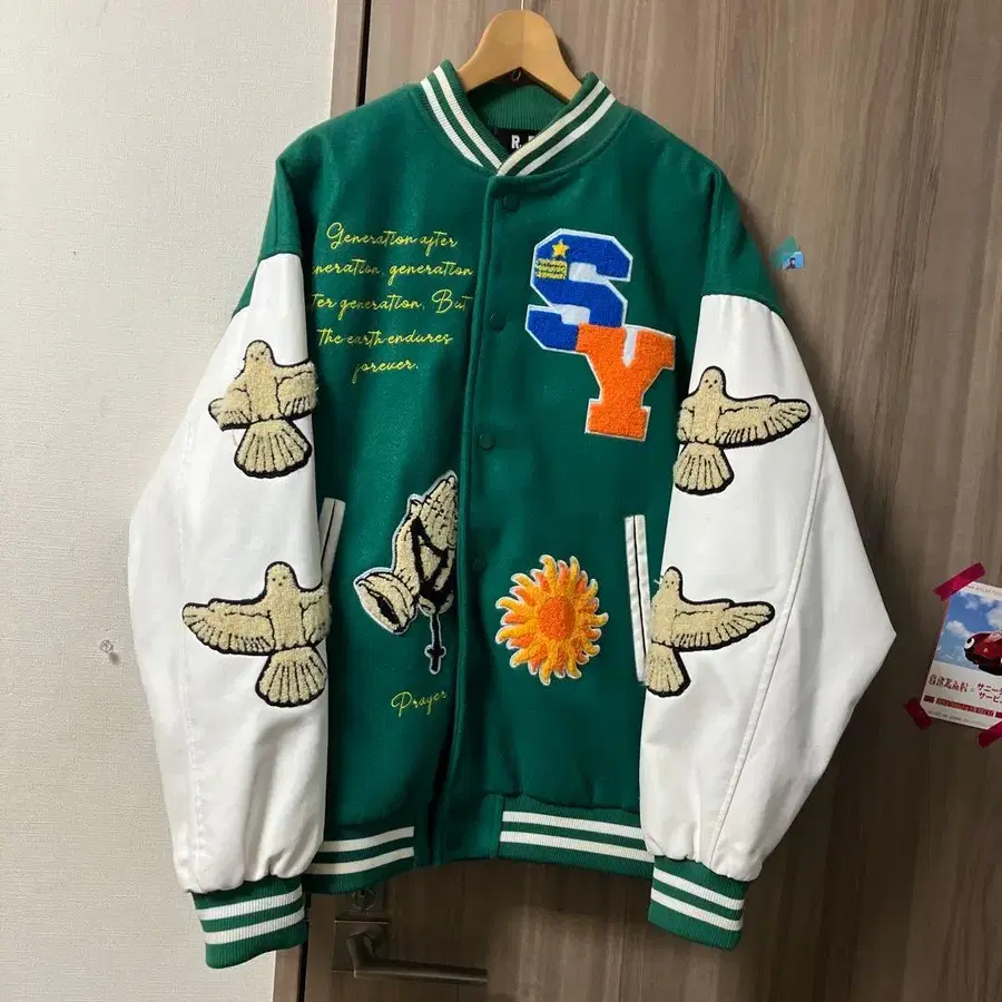 자수 디자인 바시티 자켓 그린/화이트