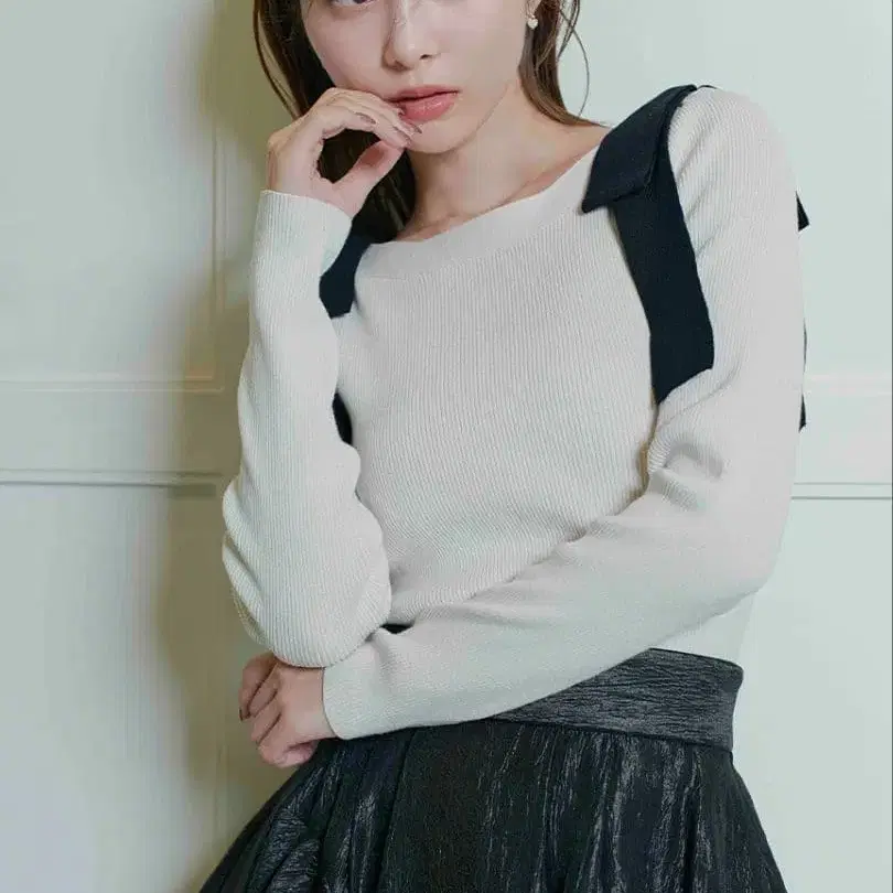 양 어깨에 장식된 니트 리본이 원포인트인 상의입니다.