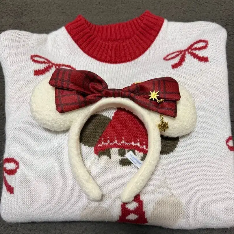 미키 귀 모양 머리띠 체크 무늬 리본 포함