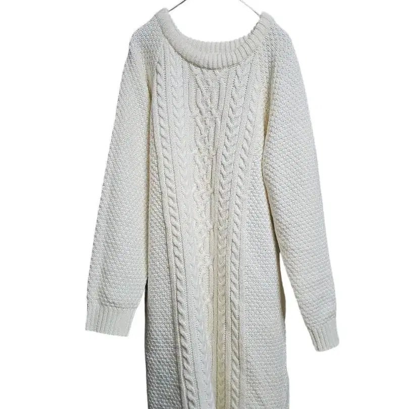 자동 번역되었어요. 원문보기케이블 짜임 디자인의 화이트 니트 원피스, 긴팔 오프숄더 스타일.