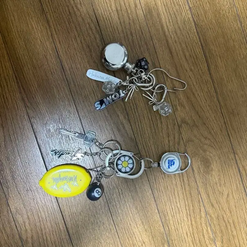 다양한 디자인의 키링 세트, 캐릭터나 로고가 매력적입니다.