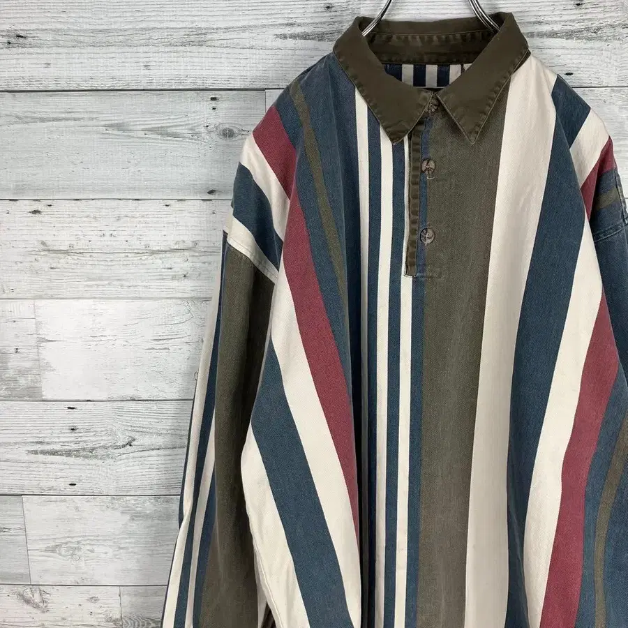 NORTHERN 90년대 절개 리브 멀티 스트라이프 하프 버튼 셔츠