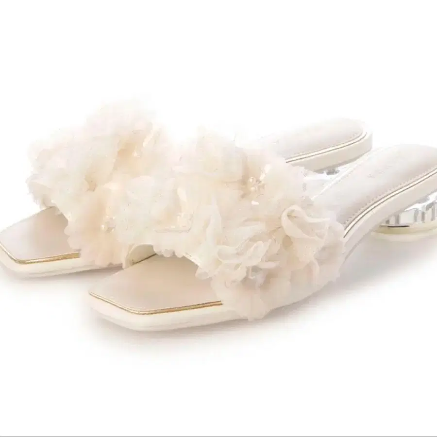 이소재를 조합한, 복슬복슬한 쉬폰 플라워가 눈길을 끄는 플랫 뮬 샌들.