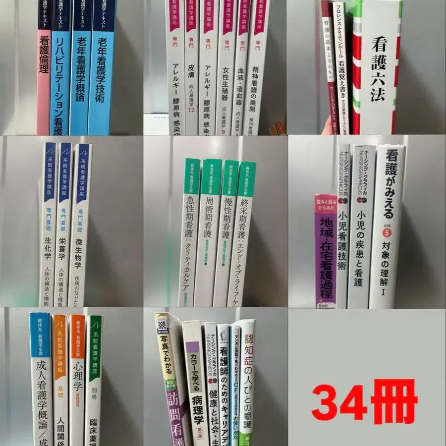 미사용품도 있지만, 마커, 1~2단어 정도의 필기, 포스트잇 자국, 2권만 도장 자국 등이 있습니다. ※ 중고품임을 이해하시는 분의 구매를 부탁드립니다. 이사 때문에 양도하게 되었습니다. 1권씩이라면 400엔으로 생각하고 있습니다. 2권부터는 1000엔을 배송비 및 종이상자 비용으로 고정하고 1권당 300엔씩 추가하는 것으로 생각하겠습니다. 묶음 구매 희망 등이 있으시면 편하게 댓글 달아주세요. 또한, 이 안에 없는 것은 필기가 많은 것들이므로 댓글 주시면 찾아보겠습니다. 병태생리학 정신 간호의 기초 정신 간호의 발전 기초 간호 기술 I 기초 간호 기술 II 여성 생식기 미생물학 간호 관리 성인 간호학 개론 노인 간호학 개론 모성 간호학 II 임상 생화학 재택 요양을 지지하는 기술 지역 요양을 지지하는 케어 간호를 둘러싼 사람과 제도 공중 보건 주술기 간호 등