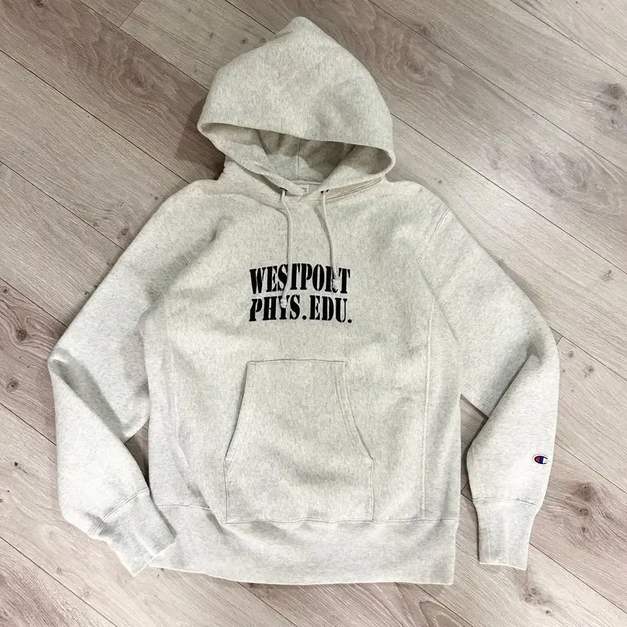 Champion의 라이트 그레이 후드티, WESTPORT PHYS.EDU. 프린트 포함.
