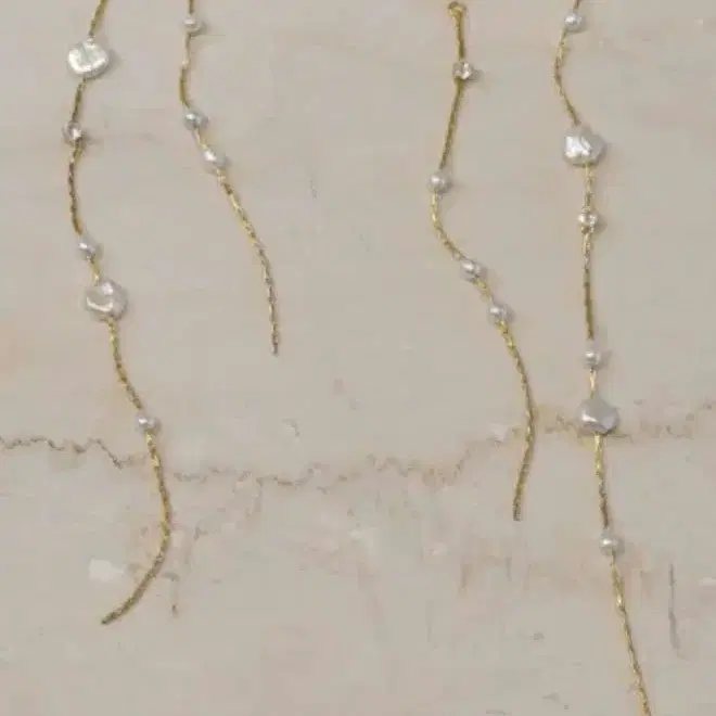 크고 작은 다양한 담수 진주와 모이사나이트를 랜덤하게 배치한 롱 귀걸이는 섬세한 디자인이면서도 볼륨감이 있어 코디네이트의 주인공이 될 수 있는 아이템입니다.