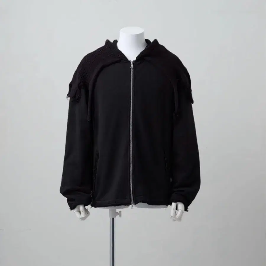 이종 소재 절개, 단처리, 데미지 가공을 조합한 GRANCY만의 엣지가 살아있는 집업 후디.